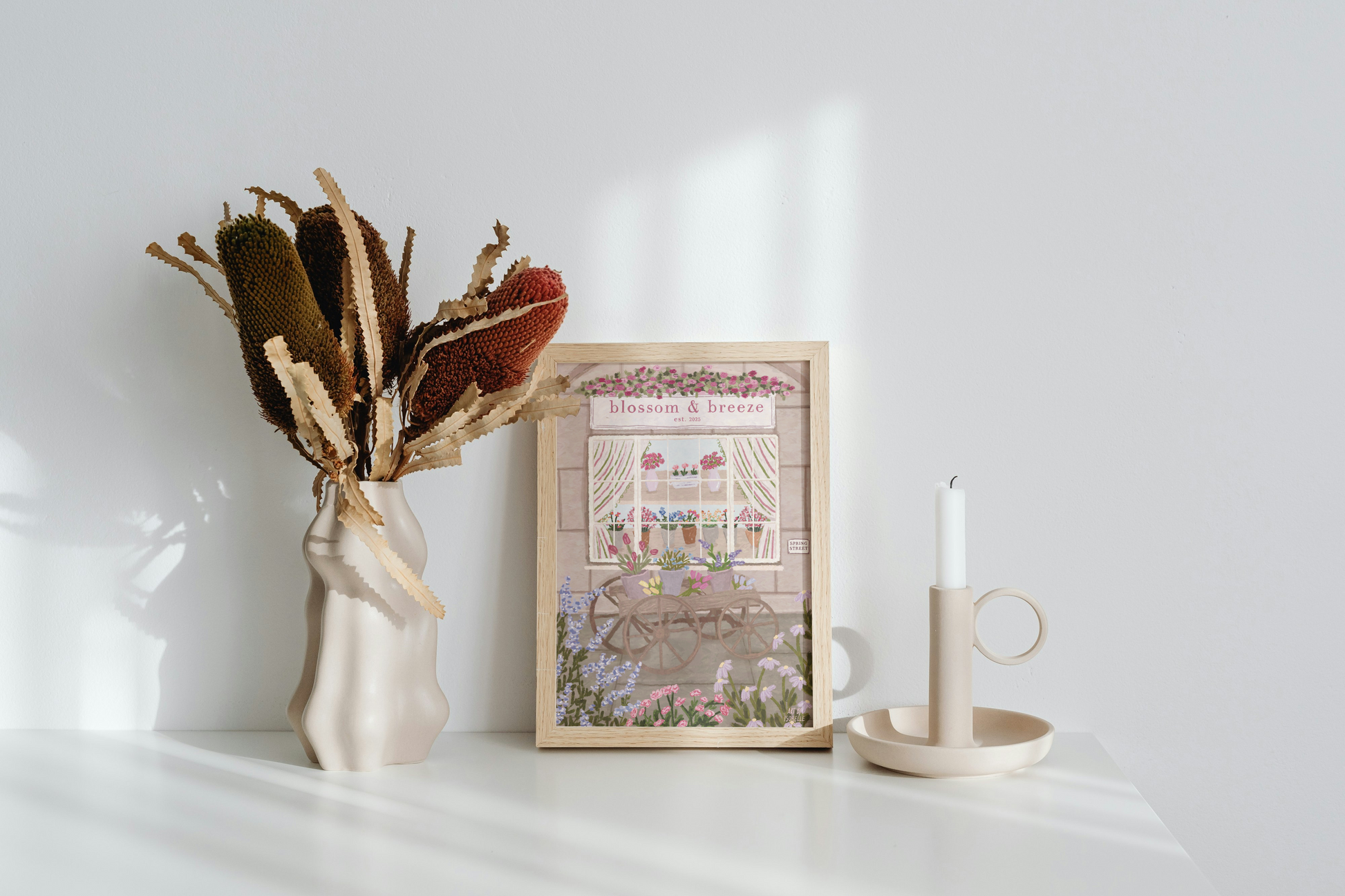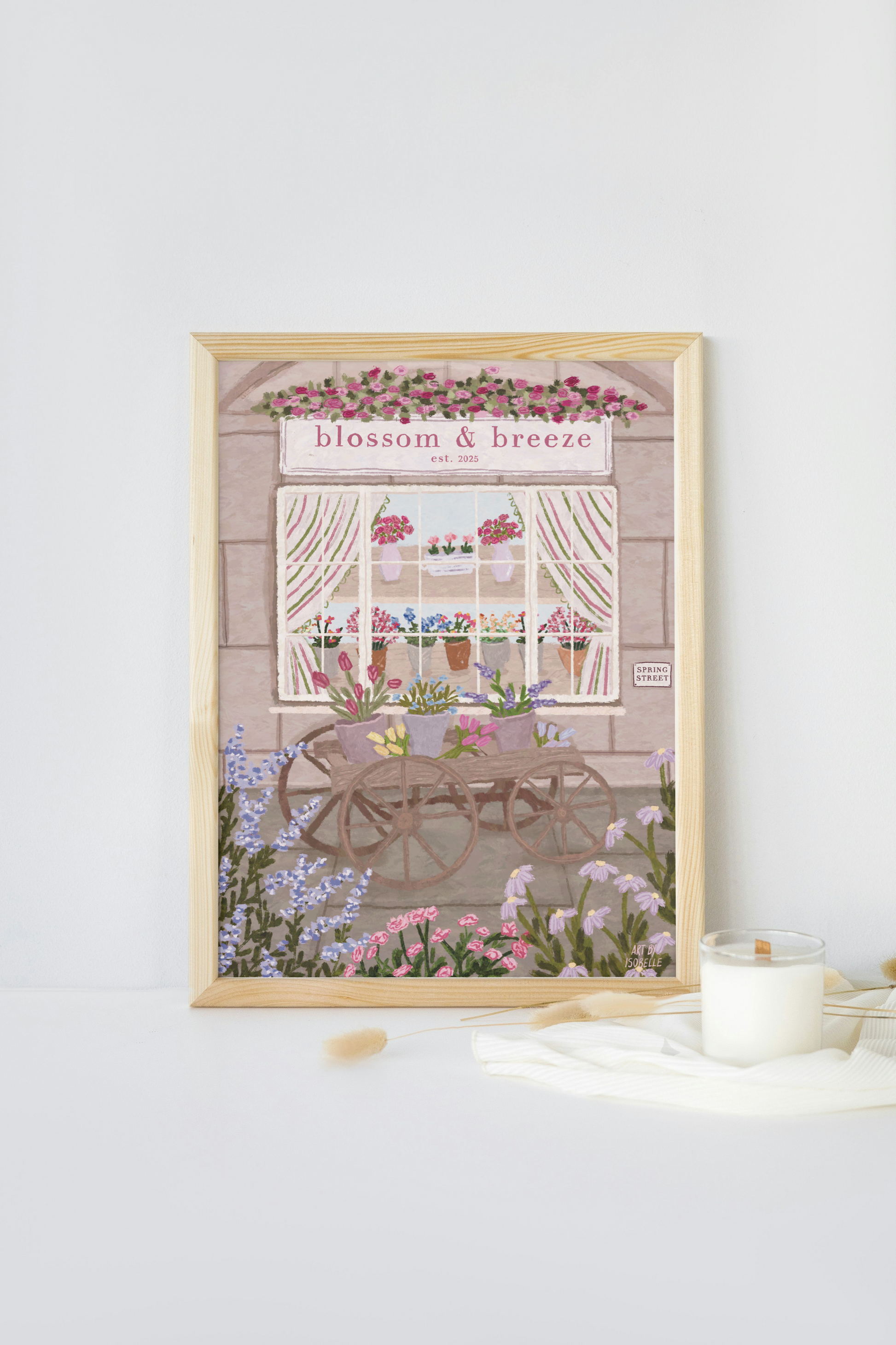 Step into the enchanting world of Blossom & Breeze, a dreamy little florist bursting with the magic of spring. This whimsical illustration captures the charm of a pastel-hued flower shop, complete with a vintage wagon overflowing with fresh blooms. Florals and lush greenery spill from the cart, welcoming visitors with the sweet scent of springtime. Bring the beauty of Blossom & Breeze into your home and let spring bloom all year round!